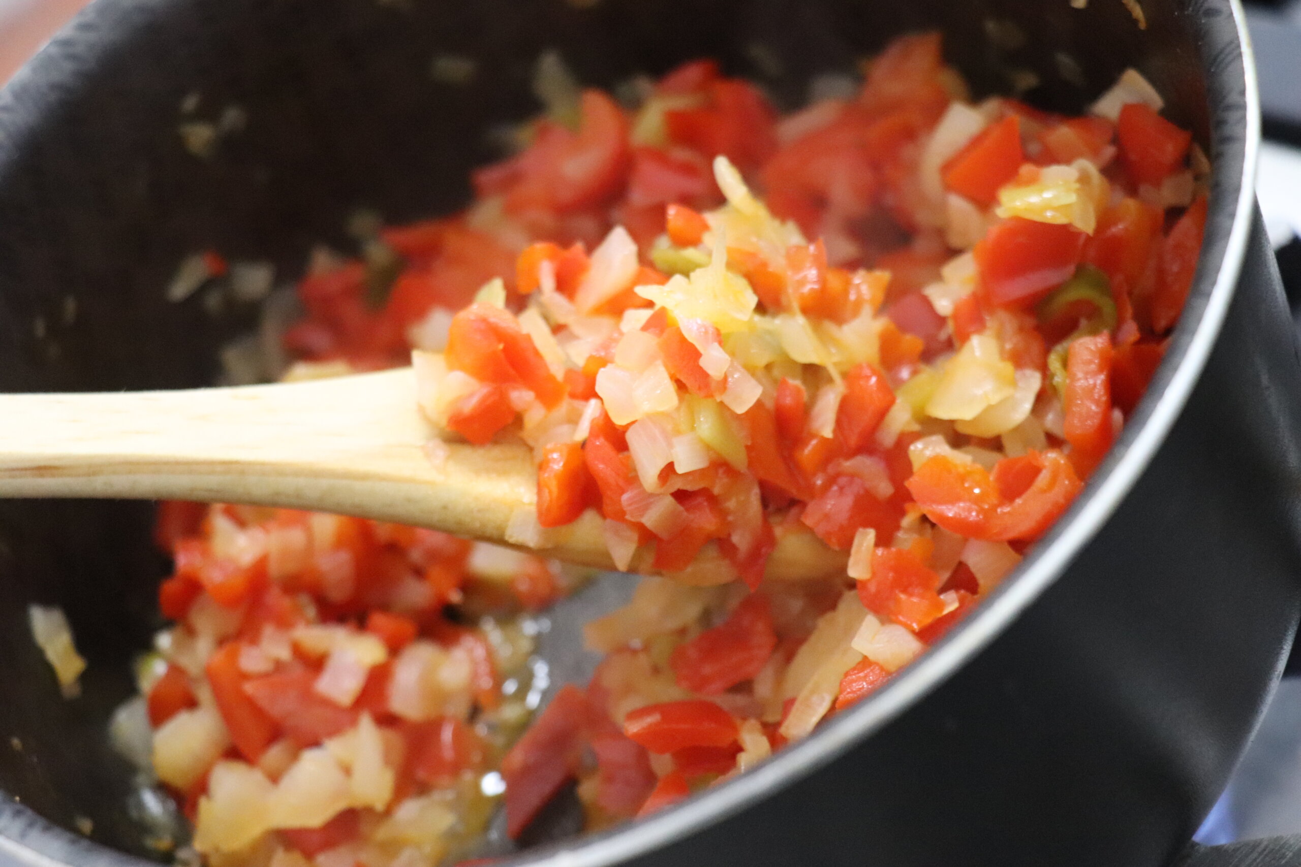 - Lavar y cortar los vegetales en brunoise (cubos pequeños) y saltearlos con una cda. de aceite de oliva.