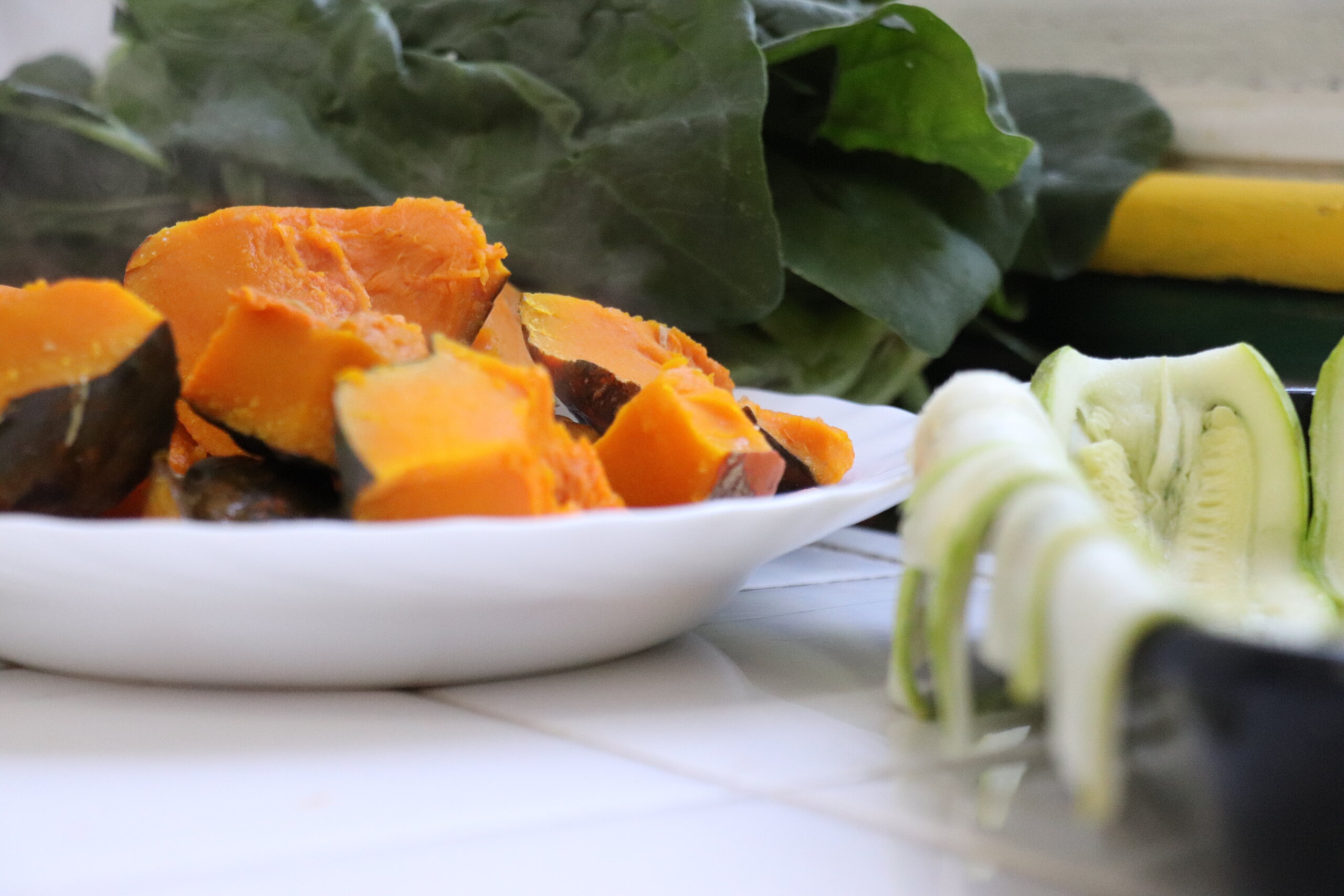 Ingredientes: 300 gr. de zuccinis, 500 gr. de zapallo brasilero, 1 atado de espinaca, 1 diente de ajo, 4 fetas de queso tipo Tybo, nuez moscada, pimienta y sal.