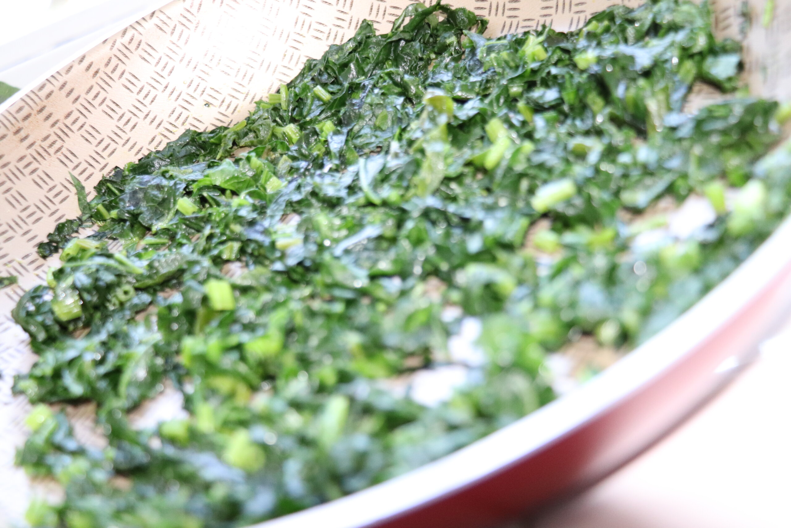 - Lavar la espinaca, cortarla bien fina y saltearla hasta que esté tierna. Retirar excedente de agua y dejar entibiar. Mezclar con claras de huevo y condimentar.