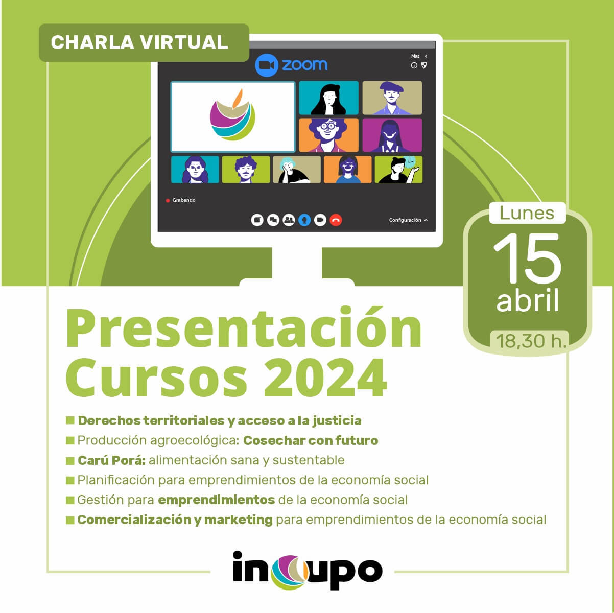 Hoy 15 de abril a las 18.30 hs se realizará una charla virtual para conocer las propuestas formativas del Instituto de Cultura Popular (INCUPO) para este año 2024. Si te interesa podes inscribirte mediante este link: https://participa.incupo.org.ar/charla_cursos_24