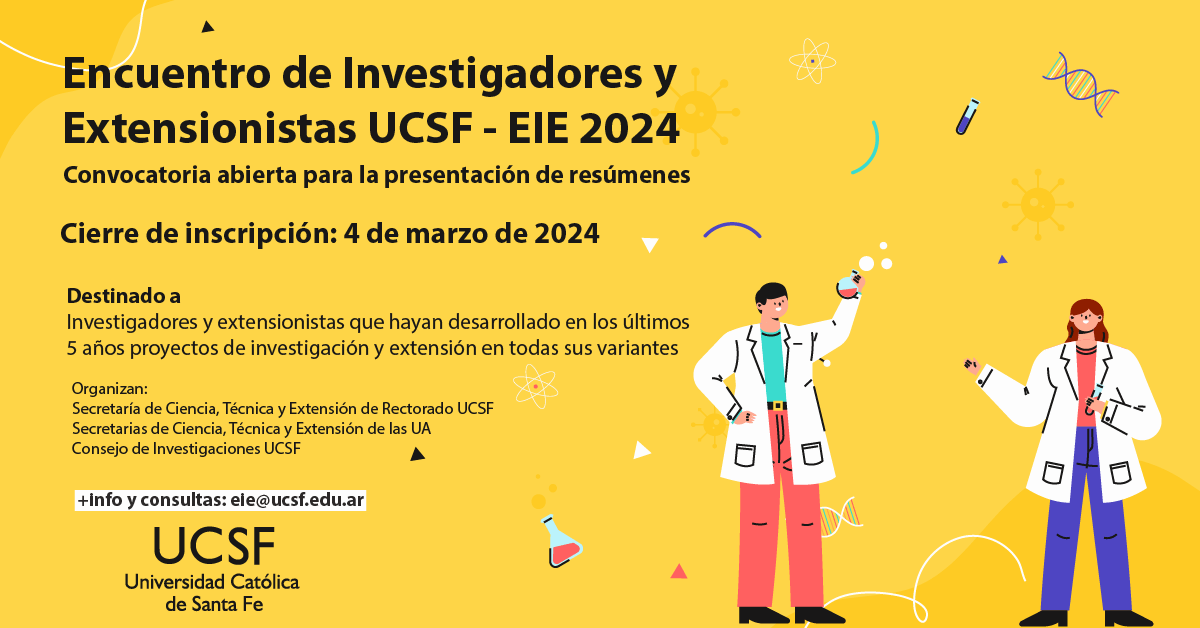 Se encuentra abierta la convocatoria e inscripción para investigadores y extensionistas de todas las sedes de la UCSF que quieran presentar resúmenes de trabajos realizados en los últimos 5 años. La fecha de cierre es el 4 de marzo de 2024.
