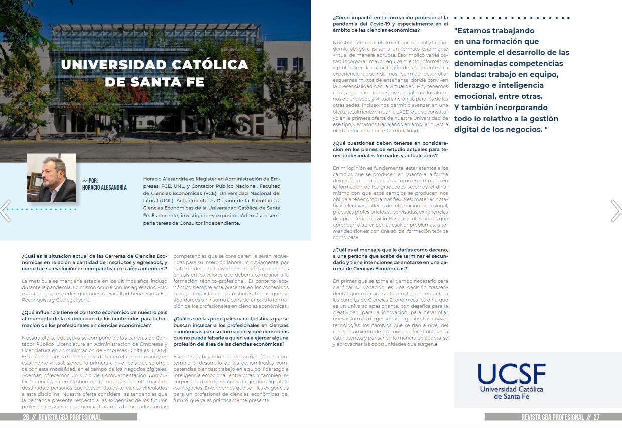 La Revista de GBA Profesional, cuya nota central analiza la situación de las carreras de las Ciencias Económicas, entrevistó al Mg. Horacio Alesandria, Decano de la Facultad de Ciencias Económicas de nuestra Casa de Estudios.