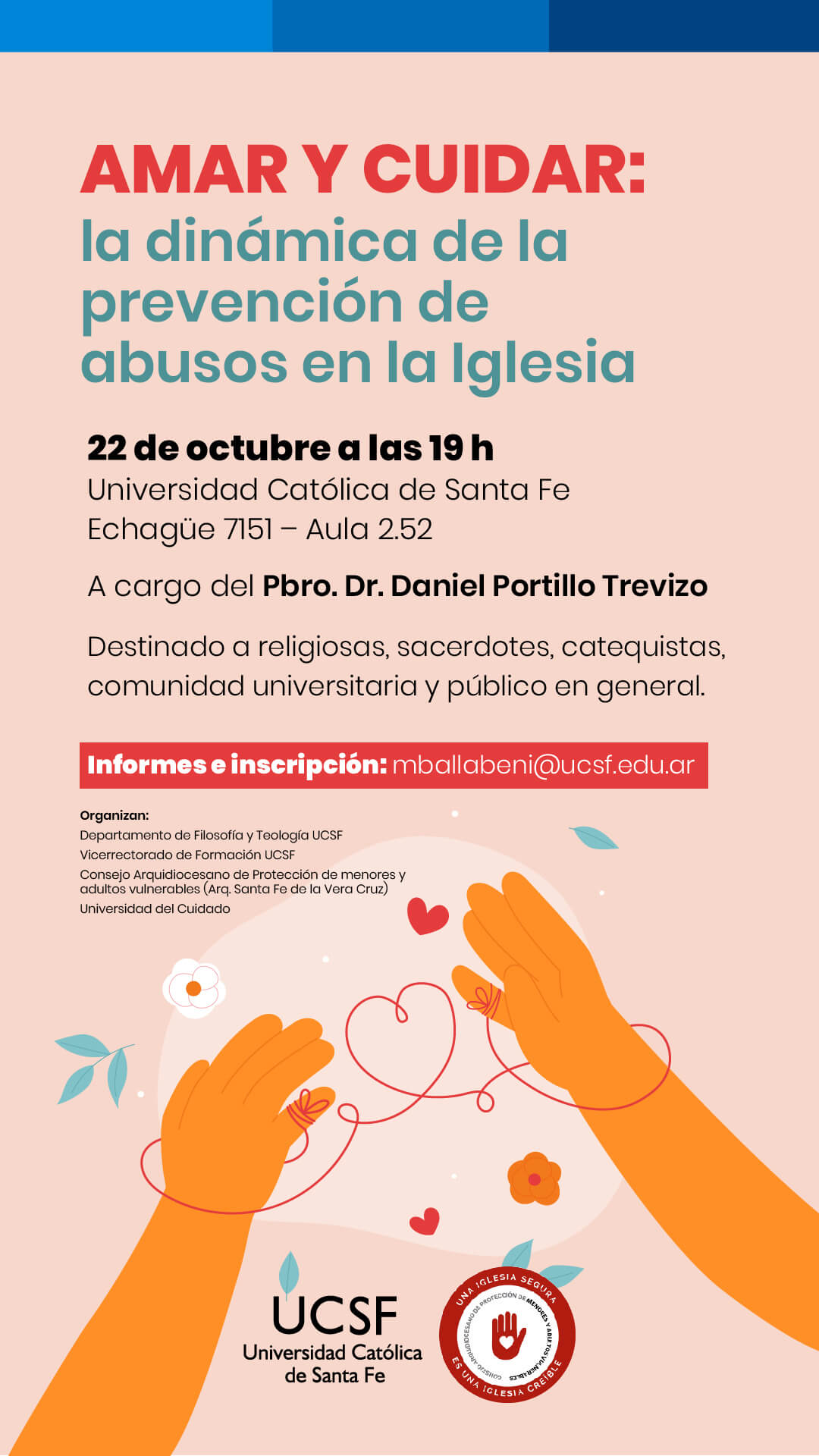 En el camino de cuidado que ha emprendido la Iglesia a través de diversas iniciativas —como la implementación de protocolos de actuación y espacios de formación—, la Universidad Católica de Santa Fe, desea sumarse activamente a la construcción de ambientes saludables donde cada persona sea cuidada en su integridad. En este marco, se propone la conferencia titulada “Amar y cuidar: la dinámica de la prevención de abusos en la Iglesia”, como una oportunidad para reflexionar sobre el compromiso eclesial en la promoción de vínculos sanos y seguros.