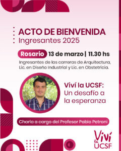 Para comenzar el año académico, se invita a todos los ingresantes 2024 al acto de bienvenida de la UCSF el jueves 13 de marzo en nuestra Sede Rosario, Moreno 1056.