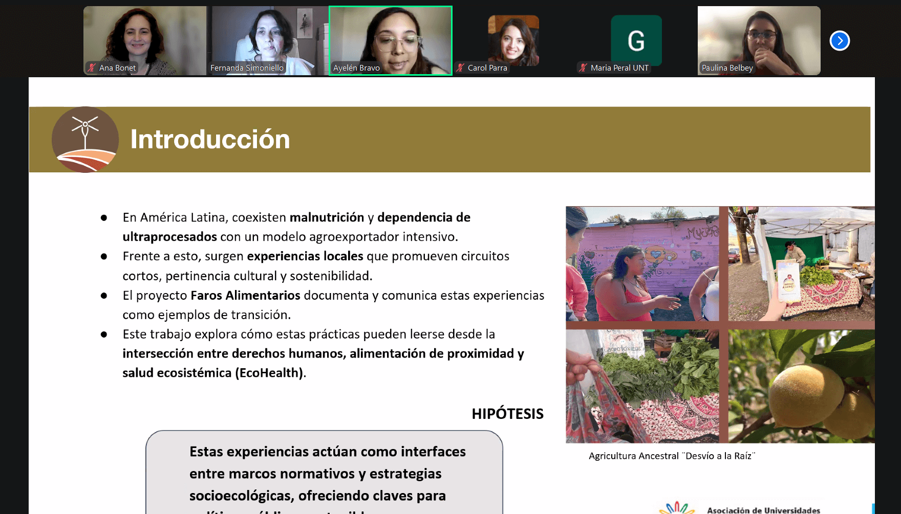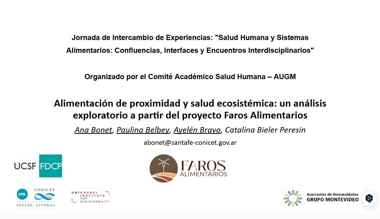La ponencia “Alimentación de proximidad y salud ecosistémica: un análisis exploratorio a partir del proyecto Faros Alimentarios”, presentada por Ana M. Bonet, Paulina G. Belbey, Ayelén Bravo y Catalina Bieler Peresin, formó parte de la Jornada de Intercambio de Experiencias “Salud Humana y Sistemas Alimentarios: Confluencias, Interfaces y Encuentros Interdisciplinarios”, organizada por el Comité Académico Salud Humana de la Asociación de Universidades Grupo Montevideo (AUGM) el dia 16 de octubre de 2025.
