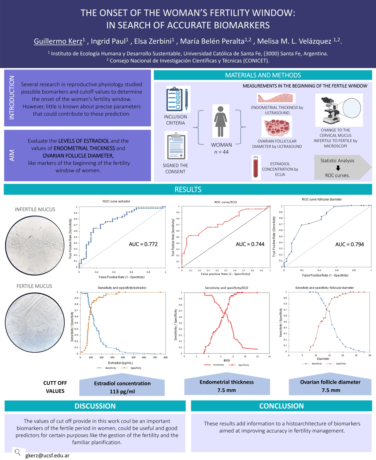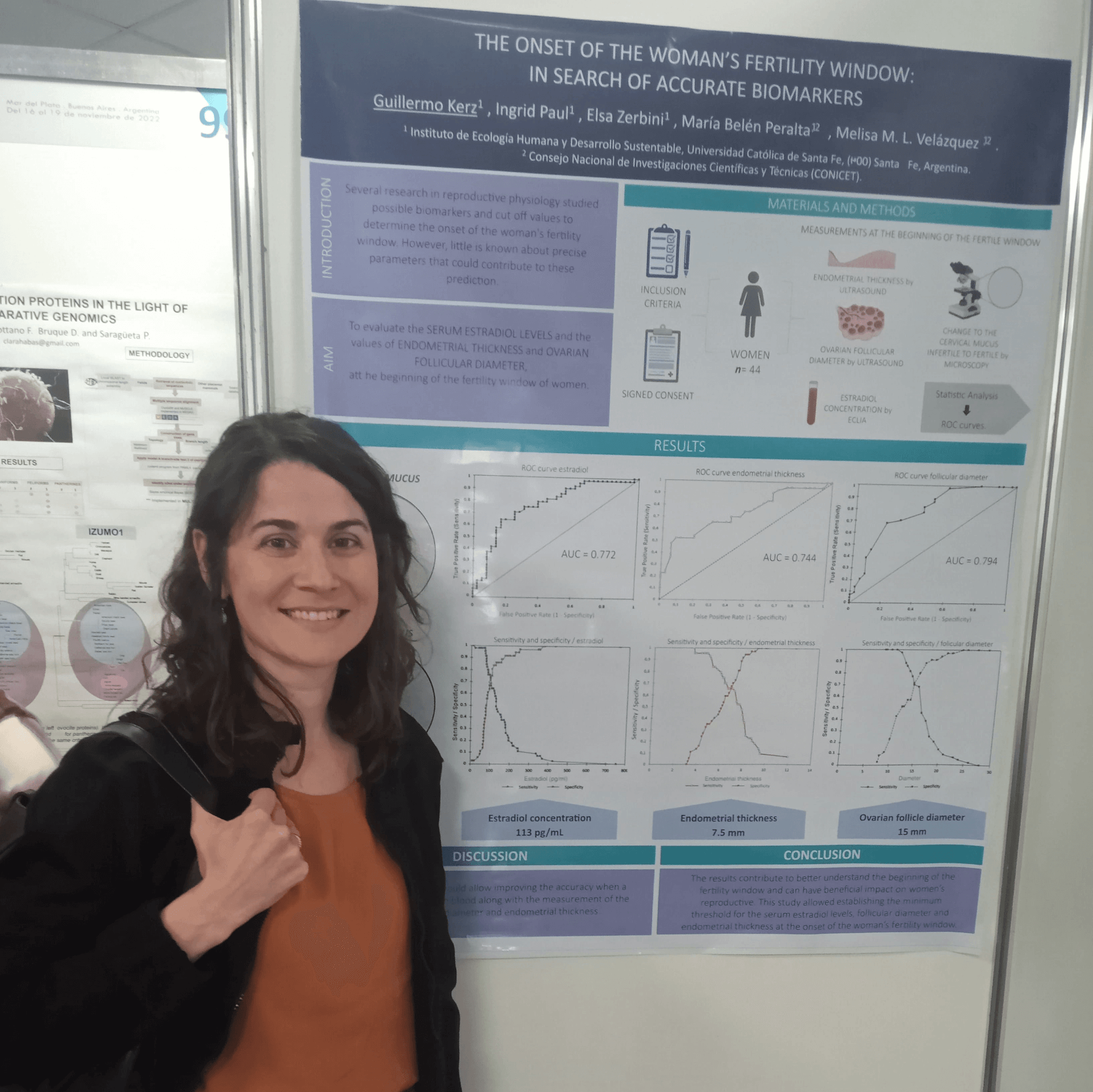 El equipo liderado por el Dr. Kerz e integrado por las investigadoras Melisa Velázquez y María Belén Peralta (CONICET-UCSF), Ingrid Paul y Elsa Zerbini (UCSF) presentaron en este encuentro el resultado de una investigación sobre la ventana de fertilidad fisiológica en la mujer, entendida como el periodo apto para lograr fecundidad dentro del ciclo femenino.