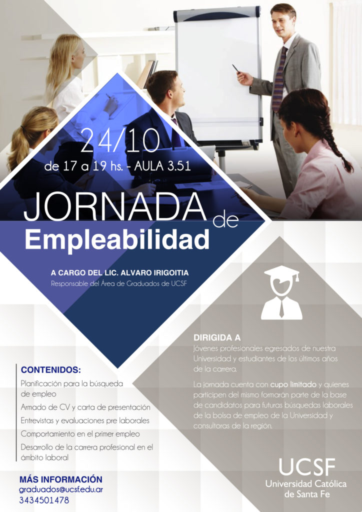 En el año 2019, con el compromiso de seguir acompañando a los jóvenes graduados en su inserción laboral, el área organiza nuevamente esta actividad gratuita. La misma se llevará a cabo el jueves 24 de octubre de 17 a 19 hs en el aula 3.51 de UCSF.
