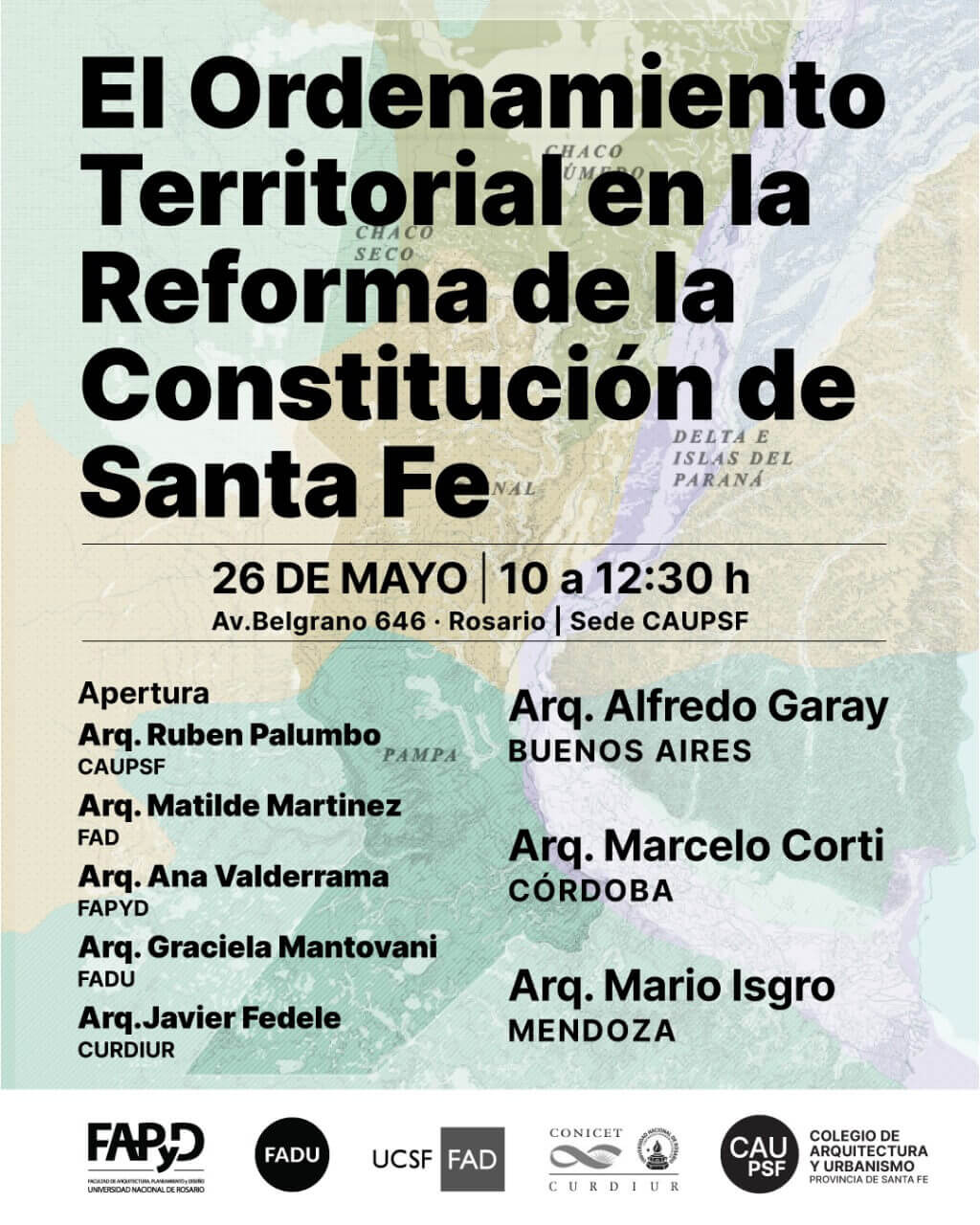 El próximo lunes 26 de mayo, de 10:00 a 12:30 hs, se realizará en la sede del Colegio de Arquitectura y Urbanismo de la Provincia de Santa Fe (CAUPSF) (Av. Belgrano 646) en Rosario, la jornada “El Ordenamiento Territorial en la Reforma de la Constitución de Santa Fe”.