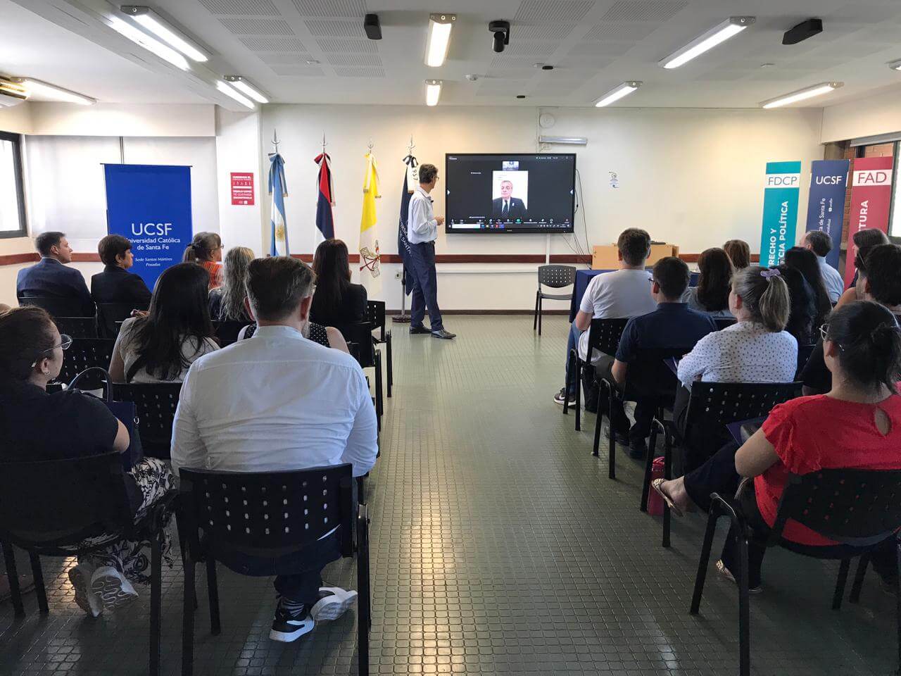 El delegado del Rector, Arq. Pablo Pachoud, dio la bienvenida a los presentes y reseñó la historia y oferta académica de la UCSF en Posadas, que incluye las carreras de Abogacía, Arquitectura, Licenciatura en Videojuegos y Tecnologías Creativas y Licenciatura en Relaciones Internacionales, además de posgrados y maestrías orientadas a las necesidades regionales.