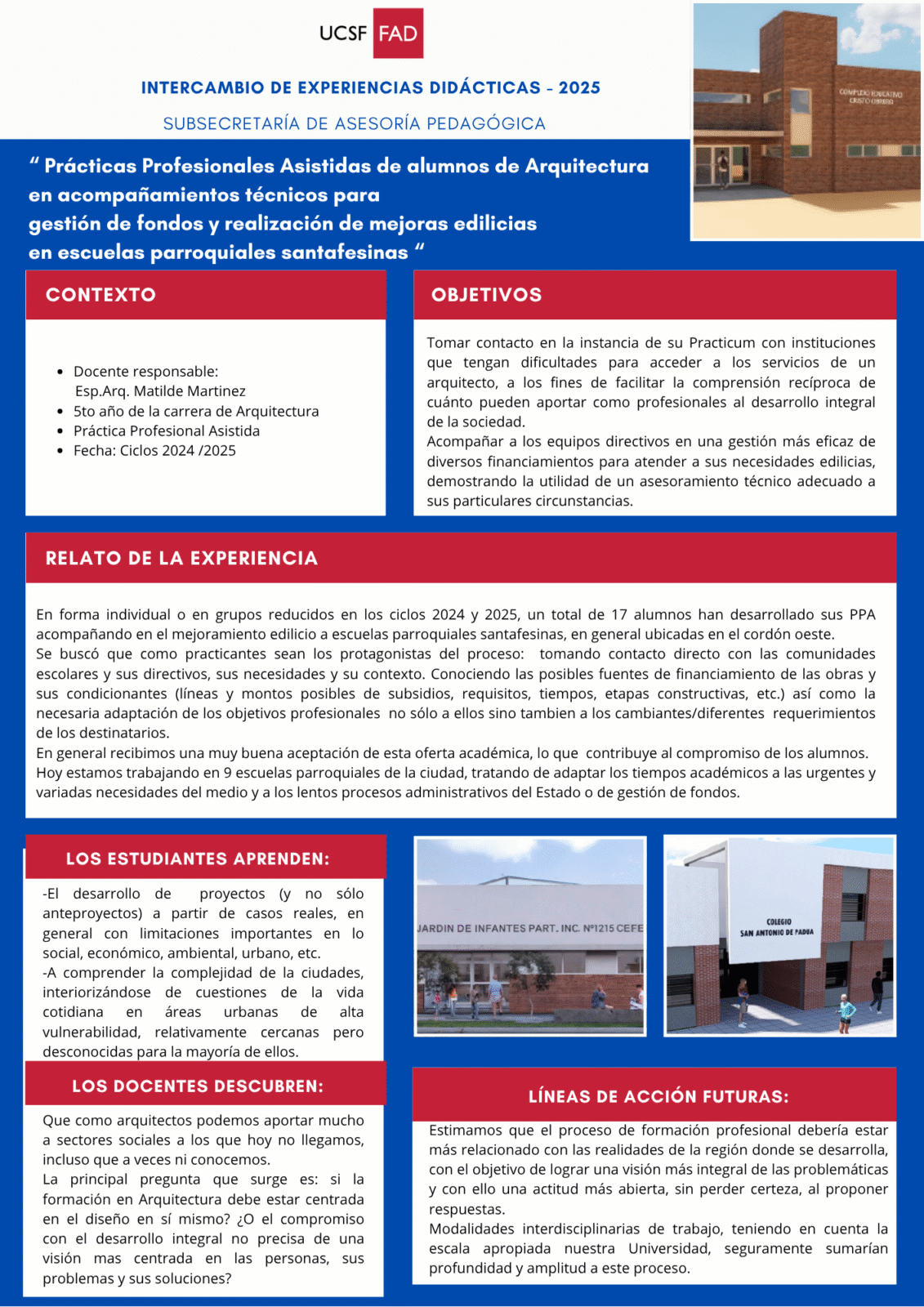 Matilde Martínez – FAD, Santa Fe: “Prácticas Profesionales Asistidas de alumnos de Arquitectura en acompañamientos técnicos para gestión de fondos y realización de mejoras edilicias en escuelas parroquiales santafesinas”.