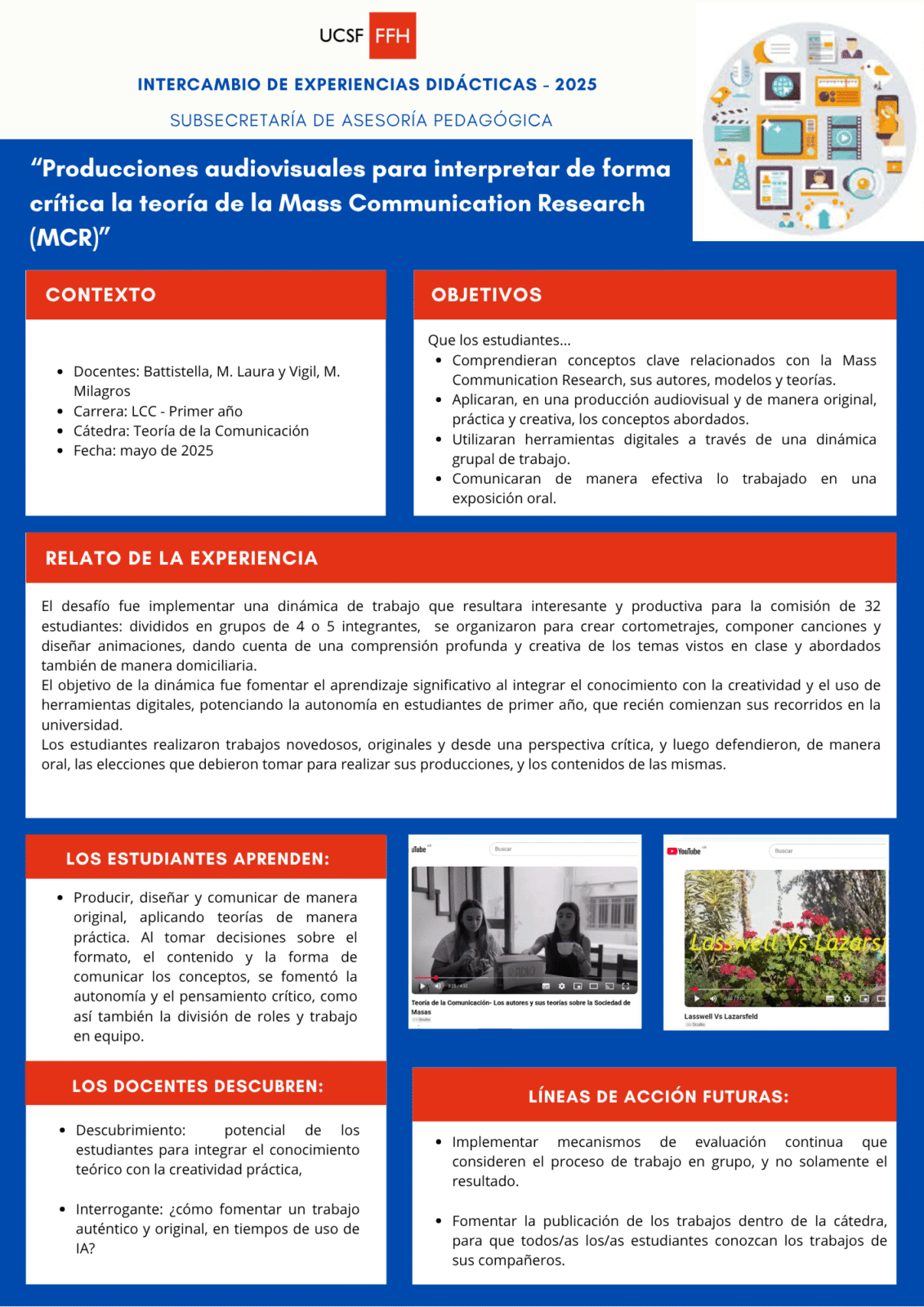 María Laura Batistella – FFyH, Santa Fe: “Producciones audiovisuales para interpretar de forma crítica la teoría de la Mass Communication Research (MCR)”.