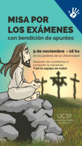 9 de noviembre a las 16 hs. Te esperamos en los jardines de la Universidad para compartir la Eucaristía y luego la merienda. Pediremos por los exámenes y se realizará la bendición de los apuntes.