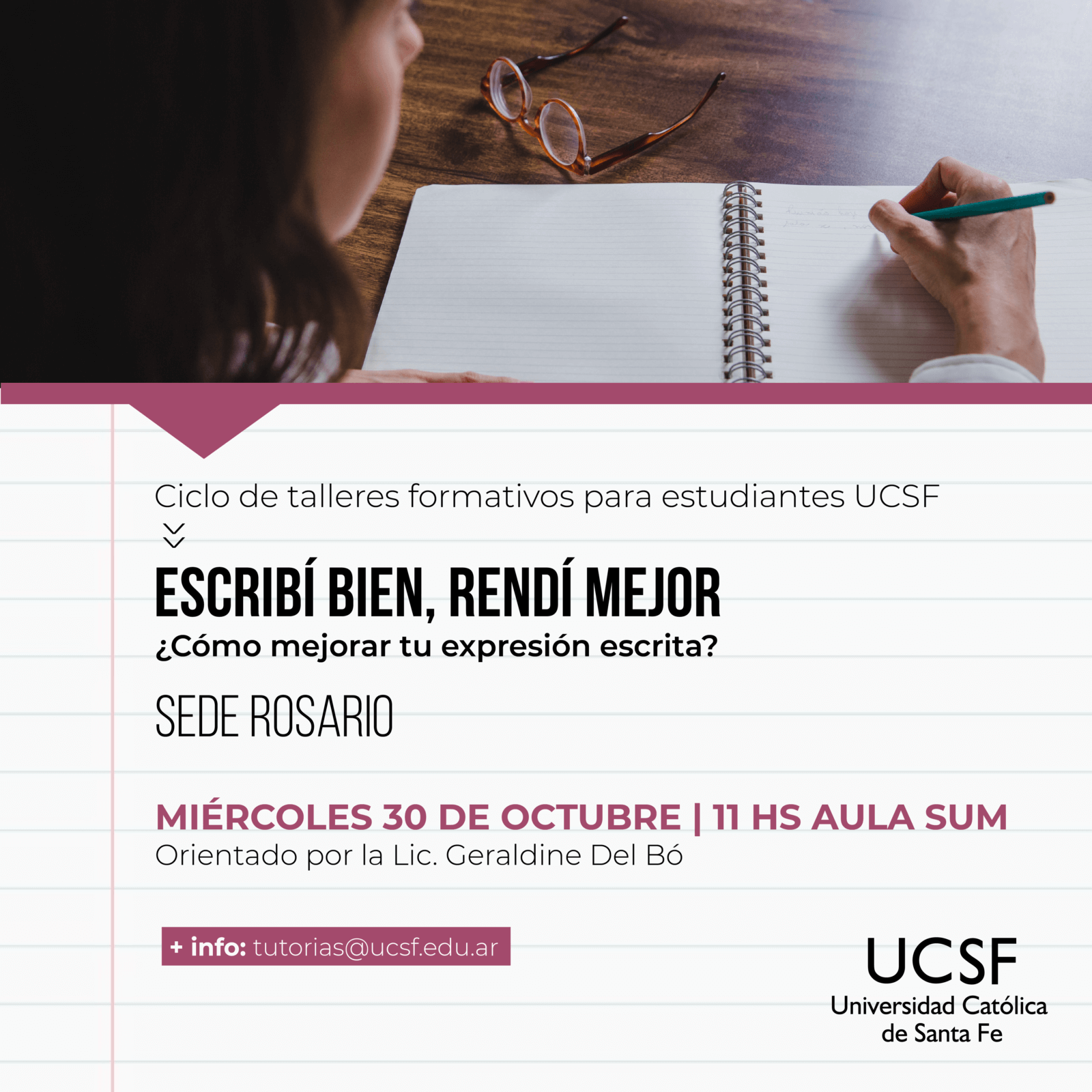 En la sede Rosario, los estudiantes aun pueden inscribirse y participar del taller sobre el manejo de las emociones (28/10 a las 10.30hs o 31/10 a las 17hs), del de mejora de la expresión escrita (30/10 a las 11hs) y del de mejora de la expresión oral (30/10 a las 18hs). Aquí más información:
