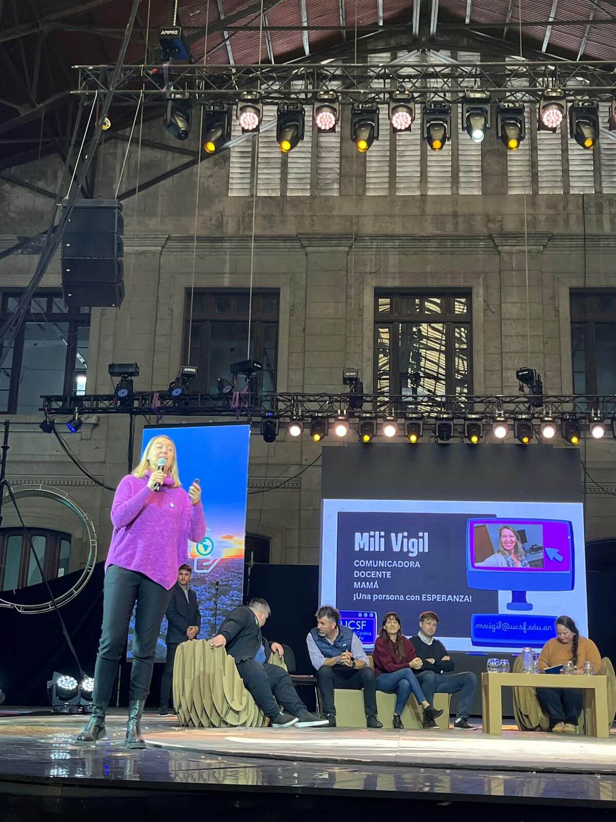La decana de la Facultad de Filosofía y Humanidades, Lic. María Milagros Vigil, integró el panel Innovación en energías renovables y optimización de recursos, donde reflexionó sobre las “palabras reciclables” y el papel de la comunicación como motor de transformación.