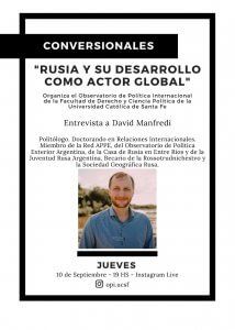 En esta oportunidad nos acompañará David Manfredi, politólogo y doctorando en Relaciones Internacionales. Miembro de la Red APPE, del Observatorio de Política Exterior Argentina, de la Casa de Rusia en Entre Ríos y de la Juventud Rusa Argentina. Mandfredi también es investigador senior del Centro de Estudios Internacionales de la UCA. Becario 2019 de la Rossotrudnichestvo y la Sociedad Geográfica Rusa.